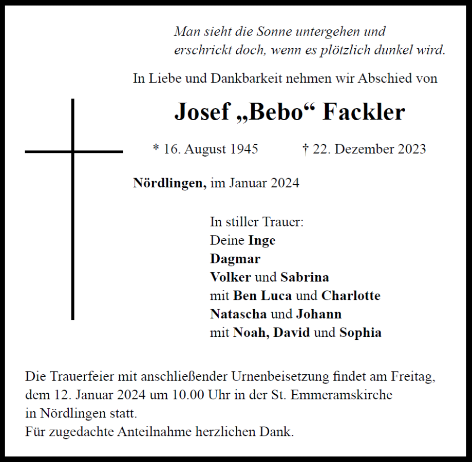 wir wünschen Ihnen von Herzen viel Kraft, dass Sie Menschen um sich haben, die Ihnen in dieser schweren Zeit beistehen und Halt geben. Zusätzlich können Sie auf dieser Gedenkseite Erinnerungen teilen und so das Andenken gemeinsam wachhalten.